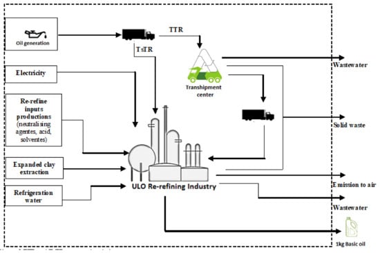 The collection/trans-shipment stage is characterized by all activities related to ULO collection at the generation center, trans-shipment (absent or present, depending on the management scenario under anaysis) at the collection center, and where subsequent destinations of the re-refining industry are conducted. The last process stage refers to the basic oil production by ULO re-refining. It consists of an industrial process that enables the removal of the contaminants and constitutes the main emissions source (for air, water, and soil) of the ULO life cycle [45], referring to the environmental dimension of sustainability as a central issue caused by the crude production process.