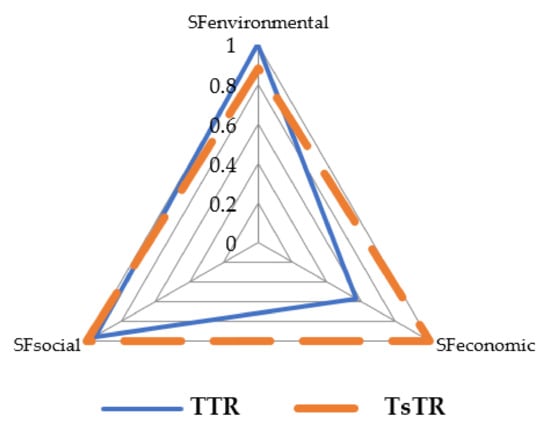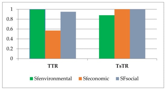 The sustainability factors in relation to the TTR and TsTR scenarios are presented in Figure 2. These show how environmental, economic, and social sustainability factors influenced the sustainability index in the two OLUC management scenarios. The difference in the scenarios’ performances is given by the percentage variation of the sustainability index, which in the case of TTR and TsTR was 12.5%, a considerable difference. Due to the need to define the best scenario for sustainability, partial analyses of each dimension were conducted, aiming to find the dimensions that contribute the most to influencing the sustainability index in one scenario or another. A conduct sustainability assessment is clearly needed for a systematic analysis of these dimensions to fill the gap for better-informed decision makers and to make these three dimensions more integrated with some more well-established life cycle methodologies by aligning them with the phases defined in the base standard (ISO 14040) and other sowed by [53].