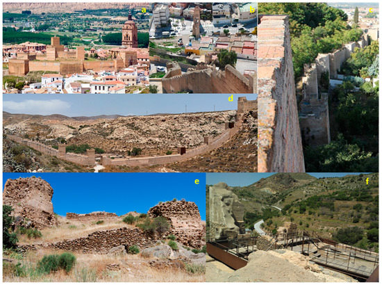 Among the fortifications analysed in the Project, considering the importance given to this type of structure during the Almoravid domination, six military rammed-earth constructions in the areas of Granada and Almeria, whose renovation works can be ascribed to the first half of the 12th century, have been selected as samples. The selected assets are as follows: (1) the walls of the Alcazaba Qadīma (Figure 1c); (2) the walls of the Alcazaba de Guadix (Figure 1a)—both in the province of Granada—(3) the walls of La Hoya and Cerro de San Cristóbal (Figure 1d); (4) the urban wall of Almeria (Figure 1b); (5) the Castillejo Castle in Abrucena (Figure 1e) and (6) the Castle of Bacares (Figure 1f), the last four of these being in the province of Almeria. These constructions, located both in urban centers and in rural areas, have been chosen to present a joint analysis of both territories, which has not been conducted thus far; the characteristics of the constructions, their conservation status and the risks by which they are affected have been included. Having approximated the methodology followed in the development of the Project, the list of the six constructions selected in this study, with their particular historical-artistic characteristics, as well as the historical risks that have jeopardized their conservation, is included. Following this, given their importance within Andalusi military heritage in the selected nuclei, the particular cases of the walls of the Alcazaba Qadīma (Granada) and the walls of La Hoya and Cerro de San Cristóbal (Almeria) included in the next section have been chosen. In this section, as a final thought, the proposal of a systematic preventive conservation method for this type of at-risk heritage, based on the obtained results of the Project, is presented.