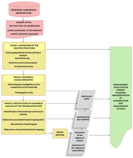 In order to achieve these aims, the selection of the six constructions was based on the chronological adscription of the foundation and renovation works developed in the first half of the 12th century, in the context of the assets included in the PREFORTI Project in the provinces of Granada and Almeria. Concerning the methodological approach, the first phase was based on a multidisciplinary analysis of the historical structures. The enhancement of its heritage characteristics has been particularly emphasized. The second phase consisted of the evaluation of impairment risks and the valuation and definition of priorities. Hereafter, the stay of conservation and the use and management of these assets have been observed. Subsequently, the relation among each hazard and the specific damages produced on each asset was established. Finally, monitoring and control methods were designed, along with the planning and design of preventive and maintenance interventions (Figure 2). This method was designed in the framework of the PREFORTI Project and was applied to samples of the defensive heritage. The obtained results demonstrate that it is feasible to intervene in a specifically sustainable manner that is compatible with the heritage and material value of the assets.