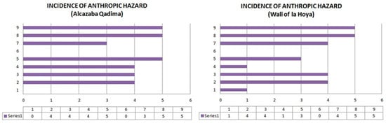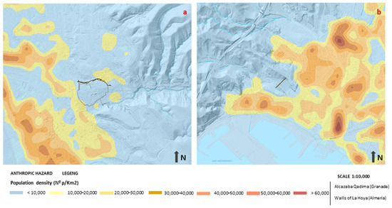 Risk maps of the anthropic risk caused by population density. (a) Walls of the Alcazaba Qadīma, Granada and (b) walls of La Hoya and Cerro de San Cristóbal, Almeria. Source: PREFORTI Project. E. Molero Melgarejo.