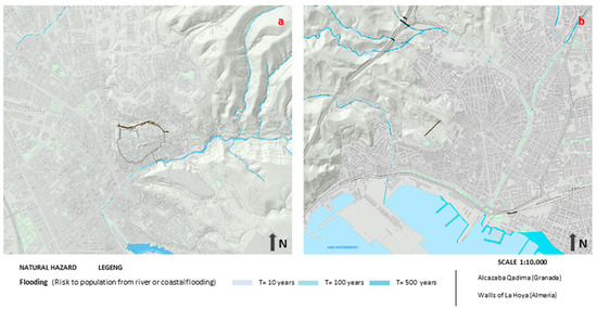 Risk maps of fluvial and maritime flood risks. (a) Walls of the Alcazaba Qadīma, Granada and (b) walls of La Hoya and Cerro de San Cristóbal, Almeria. Source: PREFORTI Project. E. Molero Melgarejo.