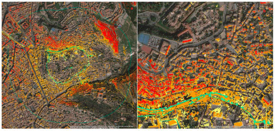 In relation to the risks that have affected the conservation of these walls, the main risk is urban pressure, especially in recent times. As it can be seen in the risk map of the population density (Figure 1a), an area near to the wall in the northeast has a high population density (10,000–20,000 people/km2), which is closely related to urban pressure and constitutes a risk to the asset. Along with this, the abandonment of some of the lands crossed by the wall has caused damages due to human activity (especially vandalism and graffiti) and natural causes.