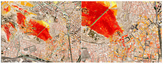 Beyond the elaboration of risk maps, GIS have been used in this work to analyse historical and strategic phenomena related to the two cases of study. In this way, maps including the analysis of visual basins from the walls of the Alcazaba Qadīma (Granada, Figure 5) and from the walls of La Hoya and Cerro de San Cristóbal (Almeria, Figure 6) have been also elaborated. In these maps, the visual basins are produced on a 2-m resolution DTM model generated from a Lidar point cloud (IGN 1º coverage). The maximum distance with high sharpness (500 m) is also included. In this way, the cartographical material uses a color scale to show a range of risks, from non-visible points to points of maximum exposure, taking the selected assets as the point of reference.