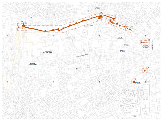 Thanks to the mentions collected in al-Bayān al-Mughrib by Ibn ‘Idhārī, we have references regarding the renovation works conducted on the walls of Granada. From 1126, the implementation of the mentioned ta’tīb tax subsidized these works, which were completed by the governor Inalū [1] (pp. 169–170). Thanks to this source, it is known for certain that the section between Bāb Ilbīra and Bāb al-Rambla was renovated at that time [1] (p. 171). In this context, it could be assumed that the section of the Alcazaba Qadīma responsible for protecting the palatine area of the city was also renovated at that time. (This area, in which the Banū Zīrī had established their original palaces and the Almoravids had the political center of their peninsular capital, was transformed during the first half of the 12th century, as recorded in al-Ḥulal al-Mawshiyya [2] (p. 147). This has been documented in the archaeological excavations at the Plaza de Santa Isabel la Real [54] (p. 199)).