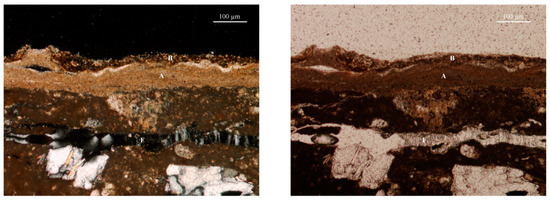 Detail of patina on the crust of the walls of the Alcazaba Qadīma (left: crossed nicols; right: parallel nicols). The patina of alteration on the lime mortar is made up of several layers: (A) patina of alteration composed of calcium carbonate and iron oxides; (B) layer of surface dirt. There are phenomena of cracking parallel to the surface (F) due to physical weathering processes associated with expansion-contraction phenomena possibly related to sudden changes in temperature [48] (p. 17).
