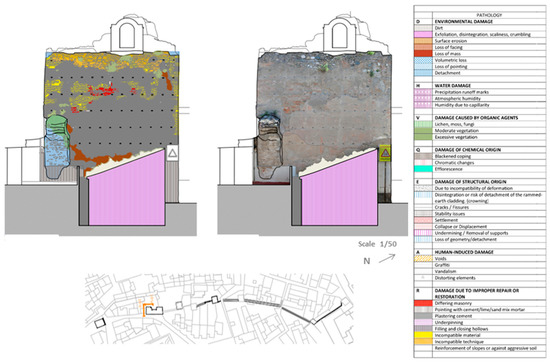 The loss of materials has also been caused by landslides caused by the steep slope of the hill, as well as by landslides caused by urban pressure, the latter of which has also meant the presence of buildings attached to the fence, as well as some located on the fence at some of their points. At the same time, damage caused by water has been detected, relating specifically to dampness due to leaks and to capillarity, as well as to rainwater (Figure 9).