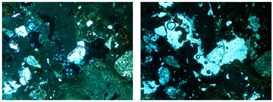 Indications of damages caused by water in the rammed earth of the walls of the Alcazaba Qadīma (area of the Gate of Hernán Román). 25× magnification. Left: crossed nicols; right: parallel nicols [49] (p. 9).