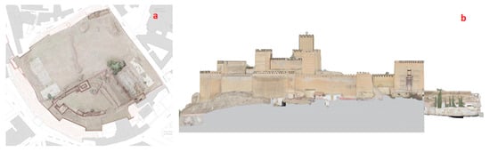 Alcazaba of Guadix. (a) Map and ortophoto of the Alcazaba of Guadix (Granada); (b) Ortophoto of the elevation of the Tower-gate. Source: PREFORTI Project. J. A. Benavides.