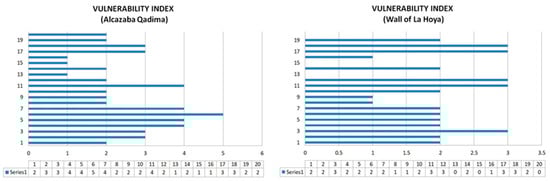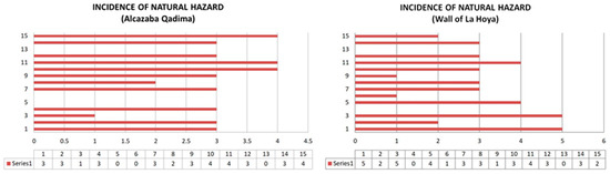 In addition to the previous methodological processes, the Delphi method has been applied in this study in order to evaluate the impact of each risk on the selected cultural assets, and to assess the vulnerability of those assets based on the effects that such risks produce on their structures [44,45,46]. For this purpose, a questionnaire that has allowed multidimensional evaluation has been generated. It has been distributed and completed by a multidisciplinary group of 15 experts from different disciplines relating to risks and conservation status of cultural heritage. The disciplines chosen have included Archaeology, History of Art, Architecture, Technical Architecture, Engineering, Geology, Chemistry, Restoration and Cultural Management. In this questionnaire, the variables of the probability of the risk occurring, the consequences it would generate and the possible measures that could be taken to minimize the effects of those consequences have been taken into account. For the assessment of hazard and vulnerability levels, each of the assessable items in the questionnaire has been assigned a numerical value between 0 and 5, where 0 means the absence of hazard and 5 means the highest level of hazard. (For a more detailed explanation of the Delphi method, see [44] (p. 6) and [47] (pp. 8–10)).