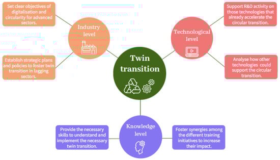 At the technological level, it has been detected that some I4.0 technologies are more implemented to achieve a more sustainable industry, reducing waste generation, and increasing energy efficiency. The following recommendations are intended to transfer these technologies across the industry system while exploring the green potential of other I4.0 technologies, with the goal of ensuring the development of the necessary technologies for an efficient twin transition.