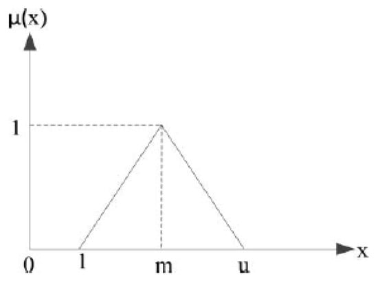 Membership functions of triangular fuzzy numbers are shown in Equation (2).