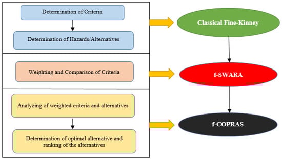 Classical risk analysis methods used in workplaces assume that the weights of all criteria are equal. However, it is not possible for all criteria to have equal importance. For this reason, the criteria must be weighted with the help of expert decision makers. In this study, a Fine–Kinney risk analysis was conducted with the new hybrid f-SC method containing two MCDM methods: SWARA and COPRAS. SWARA was integrated with COPRAS since there is no criterion weighting in the COPRAS method. After determining the criterion weights with SWARA, a risk analysis was conducted with classical Fine–Kinney and modeled by COPRAS, and an alternative list for hazards was created. In this modeling, both SWARA and COPRAS methods were implemented based on fuzzy logic. In this way, the criteria of hazards were quantified with the help of fuzzy logic. In Figure 2, the stages of the f-SC risk analysis method are given.