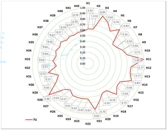 After the normalization of alternatives, Pi and Ri values were determined with the help of Equations (12) and (13). Since there was no benefit criterion, the Pi value was zero for all the alternatives. According to the calculated Ri values, the lowest score was the H11 alternative with Rmin = 0.016. After the calculations, and values were obtained. The ultimate values calculated using Equations (14)–(17) are given in Table 12. Furthermore, the rankings of the alternatives are given in Table 12. The alternatives are ranked from the most dangerous to the least dangerous in this table. Therefore, H11 with an Ni value of 1.000 is in the 42nd row, and H7 with an Ni value of 0.557 is in the 1st row.