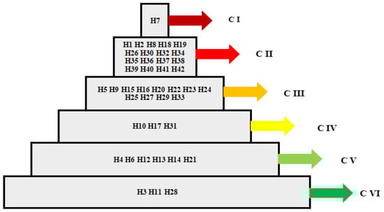 The Ni value for every alternative was calculated by COPRAS analysis. These values are given in Table 12 and Figure 3. In the calculated values, H11 with a Ni value of 1 indicates the least dangerous situation. On the contrary, H7 with a Ni value of 0.557 indicates the most dangerous situation. The priority for taking measures was determined for the alternatives/hazards between these values. The most dangerous hazard that should be dealt with immediately (H7) was in Cluster 1 only. The values in Table 13 were used for the determination of clusters, except for that containing H7. Clusters of the alternatives are shown in Figure 4.