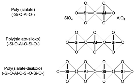 The processes of structure formation of alkaline binders in relation to geopolymer systems were considered in detail by J. Davidovits [5,6,7,8,9]. Scientists proposed a classification of structural geopolymers depending on the sequence, alternation, and also the chain length of the elements of structural units consisting of silicon, aluminum, and oxygen in the volume of the matrix: polysialats, sialat-siloxo, and polysilato-siloxo (disiloxo) (Figure 1).