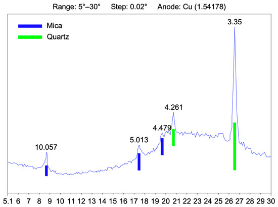 The mineral composition of metakaolin was represented by completely amorphous kaolinite (90–93%); the crystalline phase was represented by relict mica (2.5–3.0%) and quartz (4–5%); and crystalline new formations (mullite and crisstabolite) were practically absent.