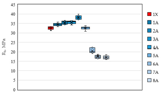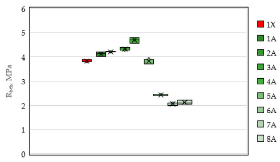The compressive strength was taken as the arithmetic mean of the test results of six halves of the beams. The calculation result was rounded to 0.1 MPa.