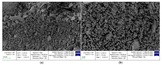 Photographs of the microstructure of samples of geopolymer concrete of composition 4A: (a) 1000× magnification; (b) 2000× magnification.