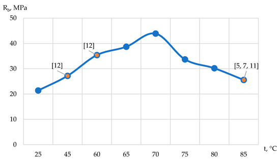 Thus, the optimal temperature range of heat treatment of geopolymer concrete samples with a duration of 24 h was determined, which contributes to the acquisition of the highest compressive strength at the age of 28 days. In addition, points based on the data [5,7,11,12] were added to the graphical dependence, as a result of which the similarity of the data obtained in the presented study with the results of other authors were found.