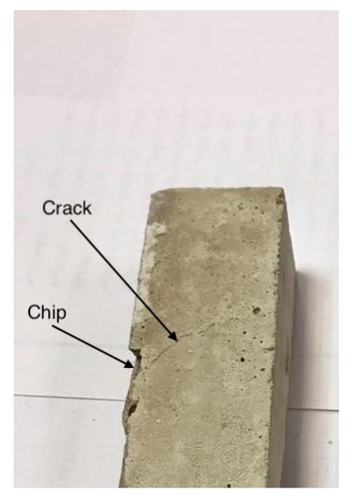 Based on the data obtained and [5,7,11,12], it should be noted that the processing temperature has a significant effect on the investigated compositions of geopolymer binders. Figure 15 shows that an increase in temperature in the range from 25 °C to 65 °C provides a strength gain at the age of 28 days up to 110% and in the range from 65 °C to 70 °C up to 130% compared to a heat-treatment temperature of 25 °C. The lowest values of the compressive strength were recorded for the samples of geopolymer fine-grained concrete treated at a temperature of 25 °C. A further increase in temperature to 75–80 °C and to 85 °C [5,7,11] leads to a decrease in strength characteristics, which is caused by the occurrence of micro- and macro-destructive processes, which are especially clearly observed in the samples of geopolymer concrete after HT at 80 °C in the form of cracks. A visual assessment of these compositions demonstrates the formation of structural deformations (cracks and chips) in the studied samples of geopolymer fine-grained concrete (Figure 16).