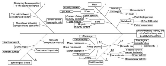 Cause-and-effect diagram of the problem of obtaining environmentally friendly and cost-effective geopolymer fine-grained concrete.