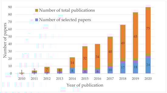 Figure 2 shows the distribution of papers over the last decade (2010–2020). There has been a growing trend of publishing papers during the considered period. In terms of selected papers, the highest number of selected papers are from the last three years, respectively. No publication was found in 2010 relating to the considered criteria of the current study.
