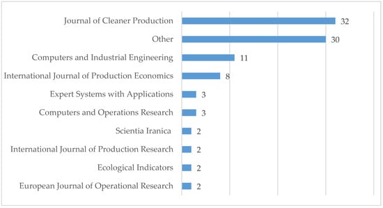 Figure 3 shows papers are distributed across 39 journals, and 30 journals have only one publication. The highest number of selected papers are from the Journal of Cleaner Production, which is approximately 34% of the total papers selected.