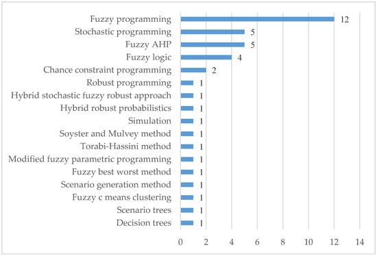 Different solution methods were used to address the uncertainty in optimization models, the most common being fuzzy programming (Figure 4). Azadeh et al. [53] used fuzzy programming to solve their model of the crude oil supply chain. The uncertain parameters considered in their model were cost and production capacity of refined products along with the consumption rate of petroleum products. Govindan et al. [68] used this method for uncertainty in a sustainable reverse logistics network design model. Pourjavad and Mayorga [73] considered uncertain parameters of return rates of products from customers, the capacity of all facilities, and product demand in designing a closed-loop supply chain model. The fuzzy AHP method for uncertain input including purchasing and transportation costs, purchasing quantities, demands, CO2 emission, and capacity levels were used by Mohammad et al. [74] (for green and resilient supply chain network design) and Mohammad et al. [75] (for supplier selection and order allocation problem). Stochastic programming was used by Rahimi et al. [76] (for sustainable supply chain network design with uncertain parameters of transportation cost, demand, and price), Ebrahimi et al. [77] (for supplier selection and location-allocation model with demand uncertainty), Ruiz Femenia [78] (to incorporate the effect of demand uncertainty on the chemical supply chains). Wang et al. [79] used robust optimization for CLSC network design under the uncertainty factors of the supply side, customer demand, and return quantities. Sharifi et al. [40] used a hybrid stochastic fuzzy robust approach in designing biofuel supply chain network designing. Rabbani et al. [80] used a hybrid robust probabilistic method for location-allocation network designing with uncertain factors of transportation cost and CO2 emission.