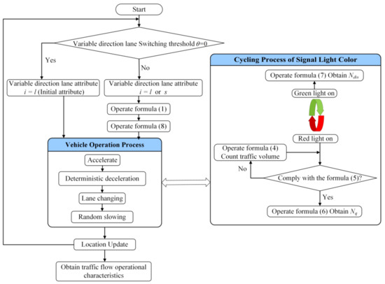 Step 4: See Equations (11) and (12) for the lane-changing rules towards the variable direction lane.