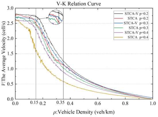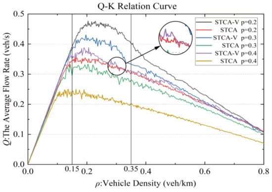 - When 0.15 veh/km < ρ < 0.35 veh/km, the difference in vehicle speeds and flow rates simulated by the two models is the largest, i.e., the STCA-V model yields the greatest benefit. Moreover, both the speed and the flow curve output from the simulation show certain oscillations. The reason is that as the vehicle density increases, the queuing vehicles follow reduced waiting times and higher driving speeds for vehicle acceleration and deceleration with increasing lane-changing behavior. The mutual interference between the vehicles makes the average vehicle speed show an unstable oscillating downward trend.
