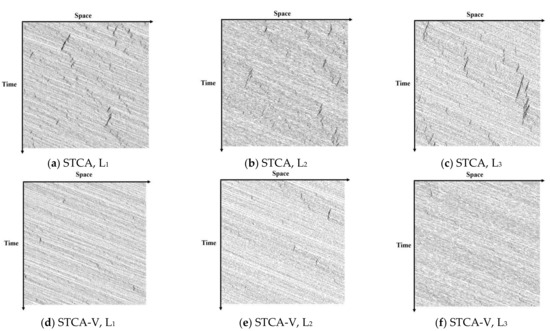 To analyze the Spatio-temporal characteristics, the vehicle density of 0.228 veh/km with a large difference in average flow is selected, and the random slowing probability is taken to be 0.2. Then the Spatio-temporal diagrams are plotted for the left-turn (L1) and variable direction lane (L2) and straight ahead (L3) for the two models, as shown in Figure 8. Figure 8a–c show the Spatio-temporal diagrams of lanes L1, L2, and L3 for the STCA model, respectively. Figure 8d–f show the Spatio-temporal diagrams of lanes L1, L2, and L3 for the STCA-V model. In this paper, the space-time diagram consists of data axes with horizontal coordinates representing the vehicle locations, vertical coordinates representing the time, black dots representing the vehicles, and white dots representing the empty cells.
