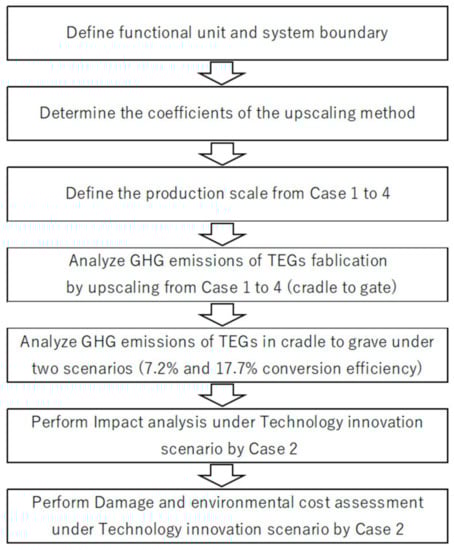 However, relatively few studies on the environmental effects of TEGs have been conducted to date [6]. In addition, the low energy efficiency of TEGs and their high manufacturing costs means that they are currently not cost effective to produce [8,9]. Several life cycle assessment (LCA) studies have examined TEG systems. For example, Karvonen et al. published a review of published literature and examined patents for waste-heat recovery technology, including thermoelectric generation [10]. Evangelisti et al. conducted an LCA of TEG systems in the treatment of municipal solid waste [11]. Murphy et al. conducted an LCA study on the Irish wood processing industry [12]. Kishita et al. recently assessed the future scenarios of GHG emissions from TEG systems for passenger automobiles [6].