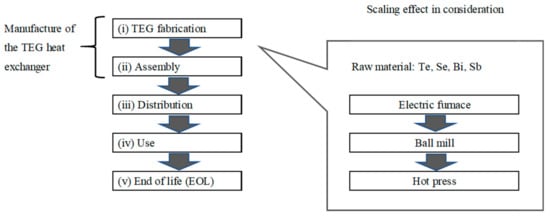 The system boundaries for the TEG heat exchanger and the TEG fabrication processes are shown in Figure 2. For the LCA, the following five stages were considered in TEG production: (1) fabrication, (2) assembly, (3) distribution, (4) use, and (5) end-of-life (EOL) [6]. Since the fabrication and assembly stages consume the most and least amounts of electricity, respectively [6], the upscaling analysis was applied to the fabrication stage in this study. TEG fabrication consists of three processes. First, raw materials such as Te, Se, Bi, and Sb are melted into an ingot in an electric furnace. Then, the ingot is crushed using a ball mill. Finally, the particles are shaped into the desired form using a hot press.