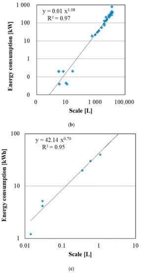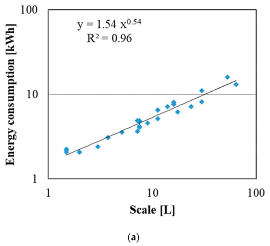 where P represents power, S is the scale of the process, f is the scaling factor, subscript 0 represents the values for the lab scale, and subscript x represents the values for the target scale; the referenced values of scale and power are obtained from Kishita et al. [6]. The scaling factor f is obtained from the specifications of the machines used in the different production scales. The scaling factors for the electric furnace, ball mill, and hot press are shown in Figure 3.