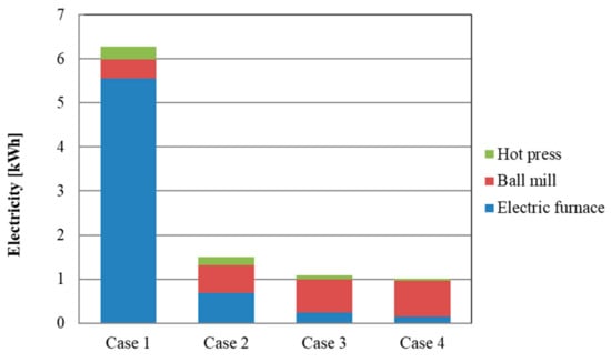 The electricity consumption associated with each stage of TEG fabrication in the four cases is shown in Figure 4. As shown in the figure, as the electricity consumption of the electric furnace and hot press are reduced as the production scale increases, the electricity consumption of the ball mill increases. The scale factor for the ball mill is >1, indicating that the electricity consumption increases with scaling. Usually, the scaling effect reduces energy consumption as the capacity of the machine increases. For example, as the capacity of the oven increases so does its volume, but the heat loss as a proportion of the surface area actually decreases as the size of the oven increases. This implies that the scaling effect works in the case of the oven. However, as the capacity (i.e., volume) of the ball mill increases, more energy is required to create the friction generated by the larger and heavier mill; hence, the scaling effect does not work with an increase in the scale of the mill. Consequently, Case 4, which was characterized by a relative decrease in electricity consumption by the electric furnace and hot press compared to the increase in electricity consumption by the ball mill over the production scale, was optimal for the production scale. Further increasing the production scale would increase electricity consumption due to the ball mill and would adversely affect the environment.