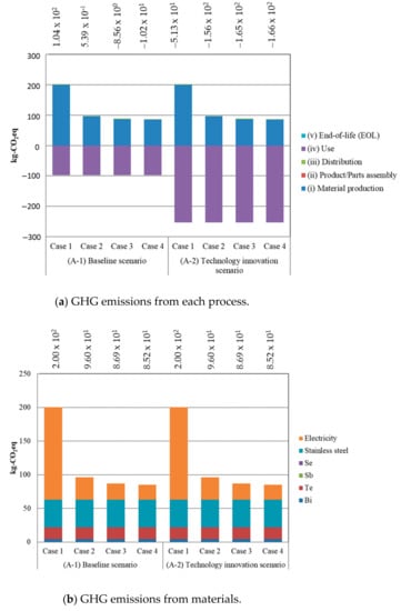 GHG emissions in two scenarios are shown in Figure 5. The majority of GHG emissions come from material production. This decreasing trend in GHG emissions is the same as that of electricity consumption shown in Figure 4 because GHG emissions are directly related to electricity consumption. During TEG usage, electricity is produced from waste heat. This electricity is counted as a GHG credit and negative GHG emission values are assigned. Since TEG devices are recycled, zero GHG emissions were assigned to the recycling process. For the baseline scenario, the GHG credit was 97.1 kg-CO2 eq/kg in all four cases. The total GHG emissions are larger than the GHG credit in Cases 1 and 2. However, in the technology innovative scenario with its higher conversion efficiency, the GHG credit was 253.2 kg-CO2 eq/kg, which was larger than the life cycle GHG emissions in all four cases.