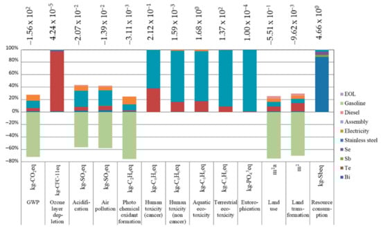 The results of the LCA under the technology innovation scenario are shown in Figure 6. Gasoline is the amount of gasoline saved by the TEG in the passenger vehicle. Diesel corresponds to materials, such as the trucks that are used for distribution in the system boundary. Here, we used Case 2 as the reference because the scale for this case is considered to reflect current conditions [6]. Depending on the category of impacts, there is a possibility that the environmental footprint might increase. In particular, the stainless steel used to fabricate the TEG heat exchanger has a marked impact on most of the impact categories because a large amount of stainless steel is used to encapsulate the TEG. The influence of Te has a marked effect on ozone layer depletion, accounting for 96% of ozone depletion in the atmosphere. In addition, Te also has a deleterious effect on the human toxicity (cancer) category. In the resource consumption category, Bi has the largest impact on the resource consumption category at 88%, implying that alternatives to Bi should be sought in the future.