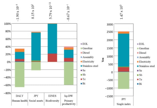 The results of the damage and the environmental cost assessments (social impacts) estimated under the technology innovation scenario (Case 2) are shown in Figure 7. The figure shows that the effect of stainless steel is dominant in all of the categories for the same reasons given for Figure 6, as a large amount of stainless steel is used to encapsulate the TEG devices. As shown in Figure 4, since energy consumption does not decrease with an increase in the scale of production, there is little room for reducing the environmental impact through changes in energy consumption. The reduction in gasoline utilization attributed to TEGs contributed to the negative values obtained for the human health and primary production categories. In terms of the environmental costs (single index), the credit was equivalent to 1055 JPY, which meant that the total index was 1466 JPY. Therefore, based on the results, the key factors for reducing the environmental impacts are to increase the efficiency of the TEG heat exchanger and to reduce the amount of stainless steel used in fabrication. In addition, substitution of or reduction in the Te in the TEG would decrease the impacts of this element on human health, biodiversity, and primary production. As stated previously, one limitation of this study is that the coefficient of resource consumption for Te is not included in the LIME2 database. Consequently, the data in the resource consumption category are likely to be underestimated.