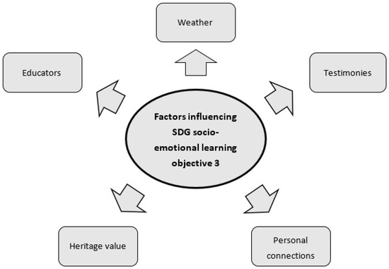 In structuring the way in which the MUME exile routes have influenced the achievement of socio-emotional learning objective three from SDG 16, five distinct factors have been taken into account: the weather, the value of the use of testimonies, the ability to create personal connections, the overall value of heritage and the routes and the role of educators (see Figure 1).