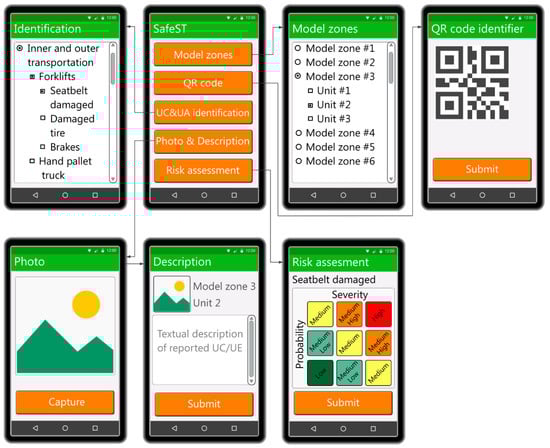 The use case was designed to demonstrate OSH learning through solving real-industry tasks (for example, during an internship or faculty lab). Students were asked to: (1) identify UA and/or UC, (2) perform a risk assessment and (3) provide measures for the risk reduction. By learning how to distinguish between UA and UC, students will proactively learn to distinguish and recognize industry challenges. The whole process is controlled and mentored by professors, who have full access to change, to adopt and to supplement archived examples, as well as to evaluate students’ reports. The evaluation assumes reviewing and grading students’ tasks (positive or negative). Before it is used, the SafeST application was preconfigured and adjusted—which includes importation of model zones and units that exist in the observed company. Examples of an assessment are shown in Figure 3.
