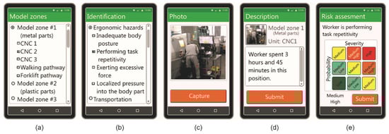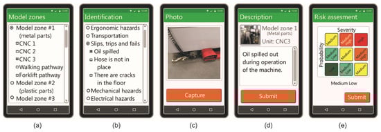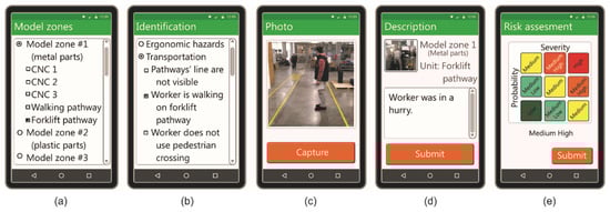 Model zone and usage of SafeST application, (a) Model zones, (b) Identification, (c) Photo, (d) Description, (e) Risk assessment.