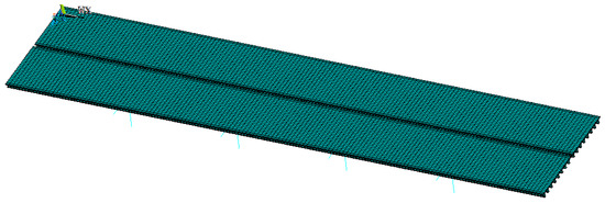 ANSYS solid 65 [17,18,19] was used as the simulation unit of the concrete bridge deck, and shell181 [20] was used as the simulation unit of the steel main girder to construct the shell body unit model of the steel–concrete composite continuous rigid beam with a π-shaped section, as shown in Figure 2. Subsequently, the vibration simulation model of steel–concrete composite continuous rigid bridges is established and discussed for the positive moment region and negative moment region of the continuous combined girder bridge.