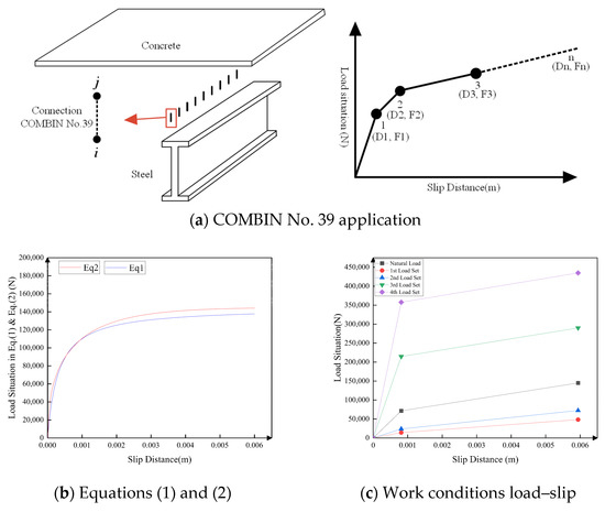 In the Tongfu No. 3 viaduct, the interface connection of the concrete deck plate and the steel main beam is achieved with shear nails, which are used as pinned connections to connect the concrete deck plate to the steel main beam. As one of the flexible connectors, the load–slip displacement principal structure relationship of the shear pegs can be described by exponential functions [22,23], such as , or hyperbolic functions [24], such as . Among others, Ollgaard and Buttry [25] defined more classical load–slip displacement equations, as shown in Equations (1) and (2).
