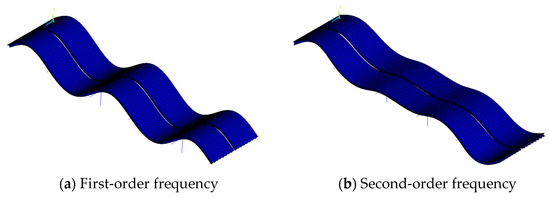 The impact coefficient is influenced by the bridge fundamental frequency [36]. The FEM of steel–concrete composite continuous rigid bridges with π-shaped cross-sections established in this paper can accurately simulate the vibration pattern and frequency of the bridge, as shown in the first-order and second-order combination beam vertical formations in Figure 4. Then, reasonable bridge samples and reasonable vehicle samples are selected to simulate the bridge deck unevenness by using fast Fourier inversion, and uneven samples are generated using MATLAB R2019b software to establish the bridge vibration simulation model of steel–concrete composite continuous rigid bridges considering the unevenness of the roadway. The displacement impact coefficient and strain impact coefficient are used as the dynamic performance indexes, and the analysis is carried out on both the positive moment region and negative moment region of the continuous beam. Varying the bridge deck unevenness, vehicle travel speed, vehicle weight, and steel–concrete joint strength, the effects of the variations in these factors on the impact coefficients at different locations are explored.