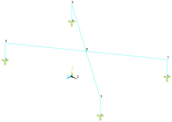 There are many types of mobile vehicles [37,38]. For this study, we chose a four-wheeled vehicle model. Considering the vertical degrees of freedom of the four wheels and the vertical degrees of freedom of the vehicle rigid body, the distance between the front and rear axles of the vehicle is 3 m, the front and rear axle distance is 2 m, and the wheelbase-to-wheelbase ratio is 0.67; these parameters reflect the real running vehicle situation and can be accurately coupled with the bridge model. The vehicle model was established with this information, meaning that different vehicle parameters (including spring stiffness and mass) will change the vehicle frequency. Five different weights of vehicles, including 20 t, 25 t, 30 t, 35 t, and 40 t, are considered, and their frequencies are shown in Table 3. The FEM of the loaded vehicle is shown in Figure 5.