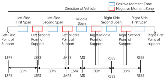 Unlike the simply supported girders, the multispan continuous girders need to bear the negative bending moment at each mid-span in addition to the positive bending moment at each mid-span under the vertical moving load, such as that induced by vehicles. Therefore, the bridge span can be divided into two parts [38]: the positive moment zone, including five areas in the side span, second side span and middle span; and the negative moment zone, including the left support point, left middle support point, right middle support point, and right support point. In Figure 6, the red area is the negative moment zone, the blue area is the positive moment zone, and the vehicle is driven from left to right. This paper first studies the dynamic performance of the bridge structure in the positive moment zone, including the middle of the side span, the middle of the second side span, and the middle of the middle span at different section positions. Second, the dynamic performance of the bridge is studied in the negative moment zone at different cross-sectional locations, including the top of the side pier and the top of the middle pier.
