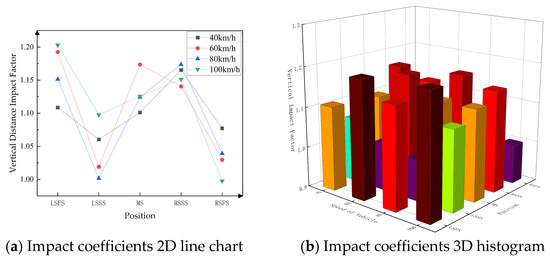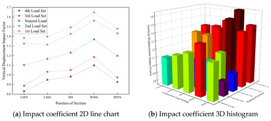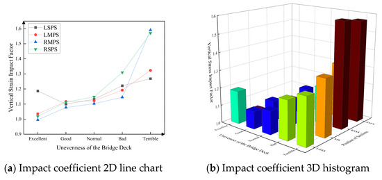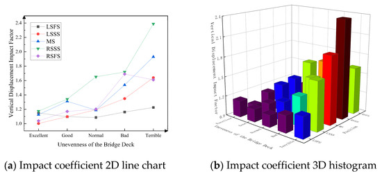 Figure 9 shows that the values of the vertical displacement impact coefficients of the steel–concrete composite rigid bridge all increase significantly as the bridge deck unevenness changes from very good to good, fair, poor, and very poor. However, the magnitudes of change in the vertical displacement impact coefficients of the steel–concrete composite rigid bridge with different cross-sections are different, and the sensitivity to unevenness of the bridge deck is not the same. It can be clearly observed from the three-dimensional diagram that the section that is most sensitive to the unevenness of the bridge deck is the right side second span (RSSS), and in contrast, the section that is least sensitive to the unevenness of the bridge deck is the left side first span (LSFS). Therefore, in the inspection of structurally similar steel–concrete composite rigid bridges, the second side spans (RSSS and LSSS) require more frequent inspection than the first side spans (RSFS and LSFS).