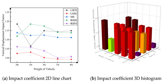 As the traffic volume increases, the mainline combination bridge carries heavier and heavier vehicles, and the change in the vehicle weight changes the vehicle frequency; this in turn affects the impact coefficient of the steel–concrete composite continuous rigid bridges to a great extent. Therefore, as the driving vehicle with a vehicle weight and frequency taken as shown in Table 3 is driven across the full bridge at a constant speed of 80 km/h, the unevenness of the bridge deck is set to be better than before. According to the vehicle weight and working conditions shown in Table 3, five finite unit models are established. The vertical displacements of the left/right side span, left/right second side span, and the middle spansections of the steel–concrete composite continuous rigid bridges are numerically simulated and extracted, and their impact coefficients are calculated, as shown in Figure 8.