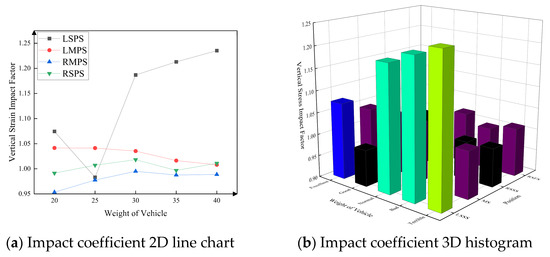 The vehicle weight variation changes the vehicle frequency, which in turn affects the impact coefficient of steel–concrete composite continuous rigid bridges. Therefore, in the excellent bridge case, the five separate vehicles shown in Table 2 were constructed to drive across the full bridge in a straight line at a uniform speed of 80 km/h. Then, the transverse strain and vertical strain of each negative moment zone pivot section of the steel–concrete composite continuous rigid bridge were extracted, and the impact coefficients were calculated, as shown in Figure 12.